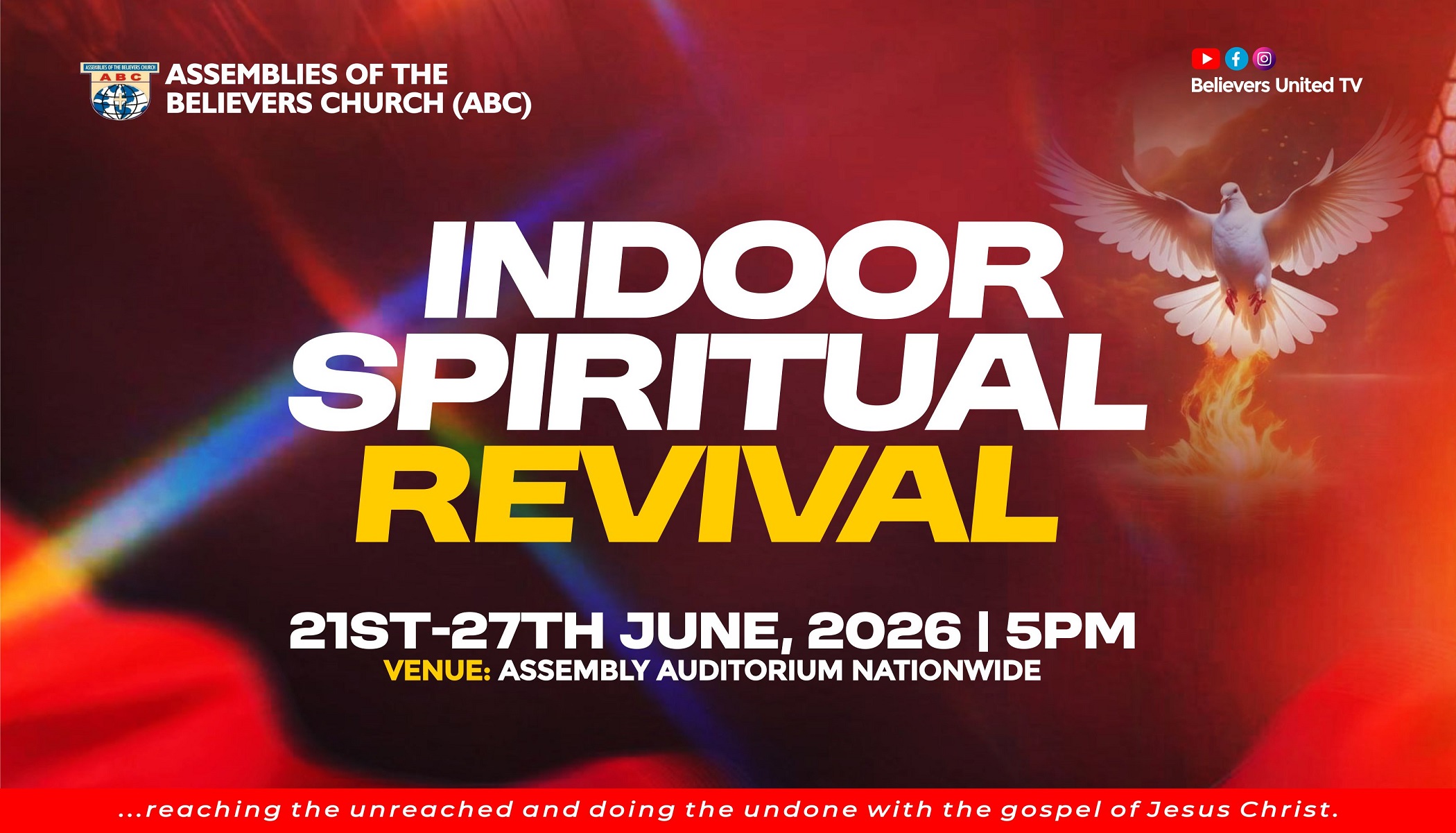 Indoor Spiritual Revival, which can also be called Sanctuary Crusade, and as well Holy Ghost Rally, is done in every Assembly and Cathedral of the church ABC on the 3rd week of June every year for 7 Days, from Sunday to Saturday, 5:00pm – 7:00pm daily. It is for every minister and members of the church ABC. It is a time of spiritual revival in the church, and time of spiritual awakens, anointing, healing, impartation of the Holy Spirit and spiritual gifts. Time of spiritual equipment which nobody should miss.